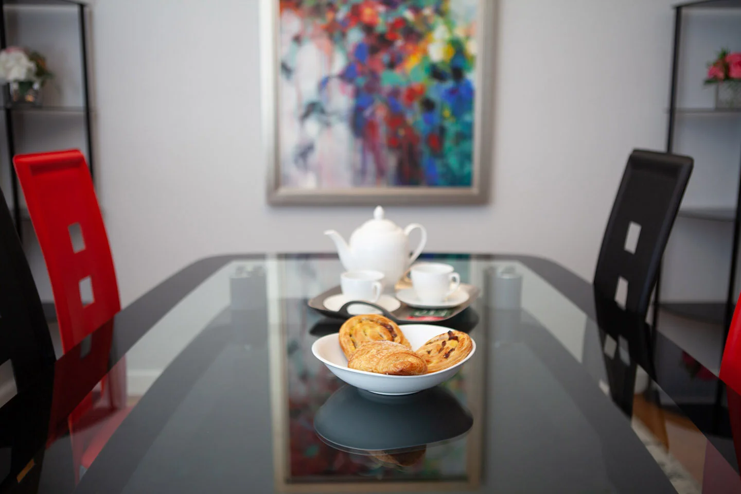 Modern furnishings, rugs, and artwork come with this charming one bedroom. Ksenija has gone through several iterations of curating the decor to find just the right pieces that fit together.